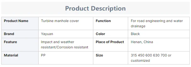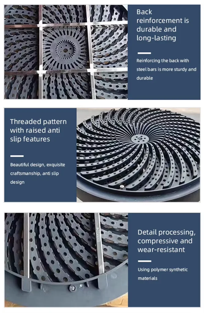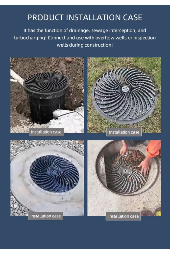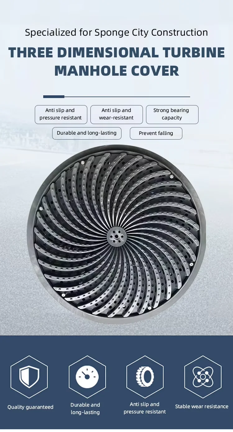 Turbine manhole covers, also known as turbine rainwater grates, are made of alloy plastic produced by injection molding machines. They can effectively intercept fallen leaves and other debris, and quickly remove rainwater, so that the surrounding roads or green belts do not accumulate water. Rainwater collection is not blocked and does not emit odor, alleviating urban waterlogging disasters during the rainy season.